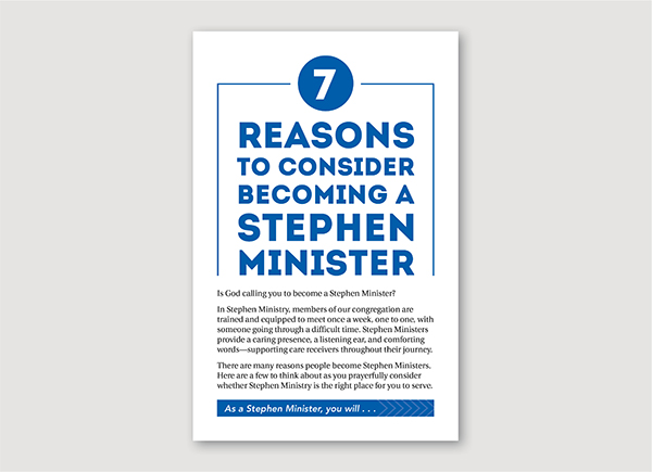 This easy-to-use “7 Reasons to Consider Becoming a Stephen Minister” recruiting tool shares meaningful benefits of serving as a Stephen Minister. The PDF contains a customizable text box for contact information and other helpful details. Also available from the S-2A page of the Stephen Leader Online Toolkit.