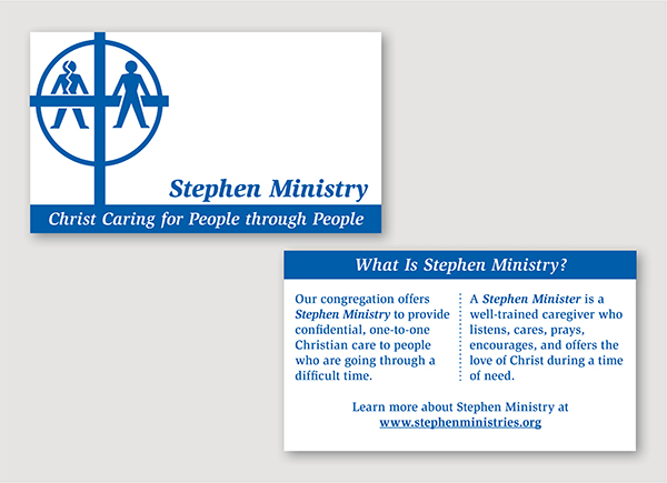 The Stephen Ministry Customizable Business Cards are great to give to potential care receivers, Stephen Minister recruits, and others as you get the word out. You can personalize them with your name, Stephen Ministry role, and other information. These business cards come in flat sheets, ready to use with a printer or copy machine.