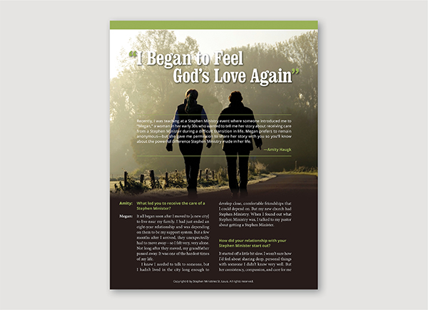 “I Began to Feel God’s Love Again” features a young woman who describes how her caring relationship with her Stephen Minister transformed her life. It’s a great resource for recruiting Stephen Ministers, finding care receivers, and building overall awareness and support for your Stephen Ministry.